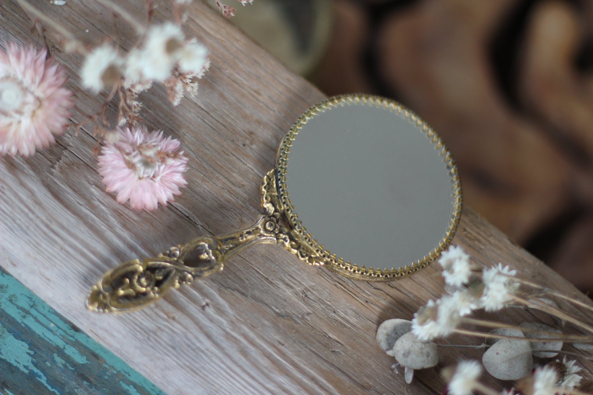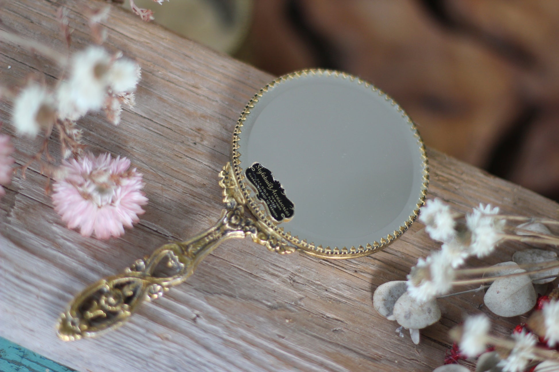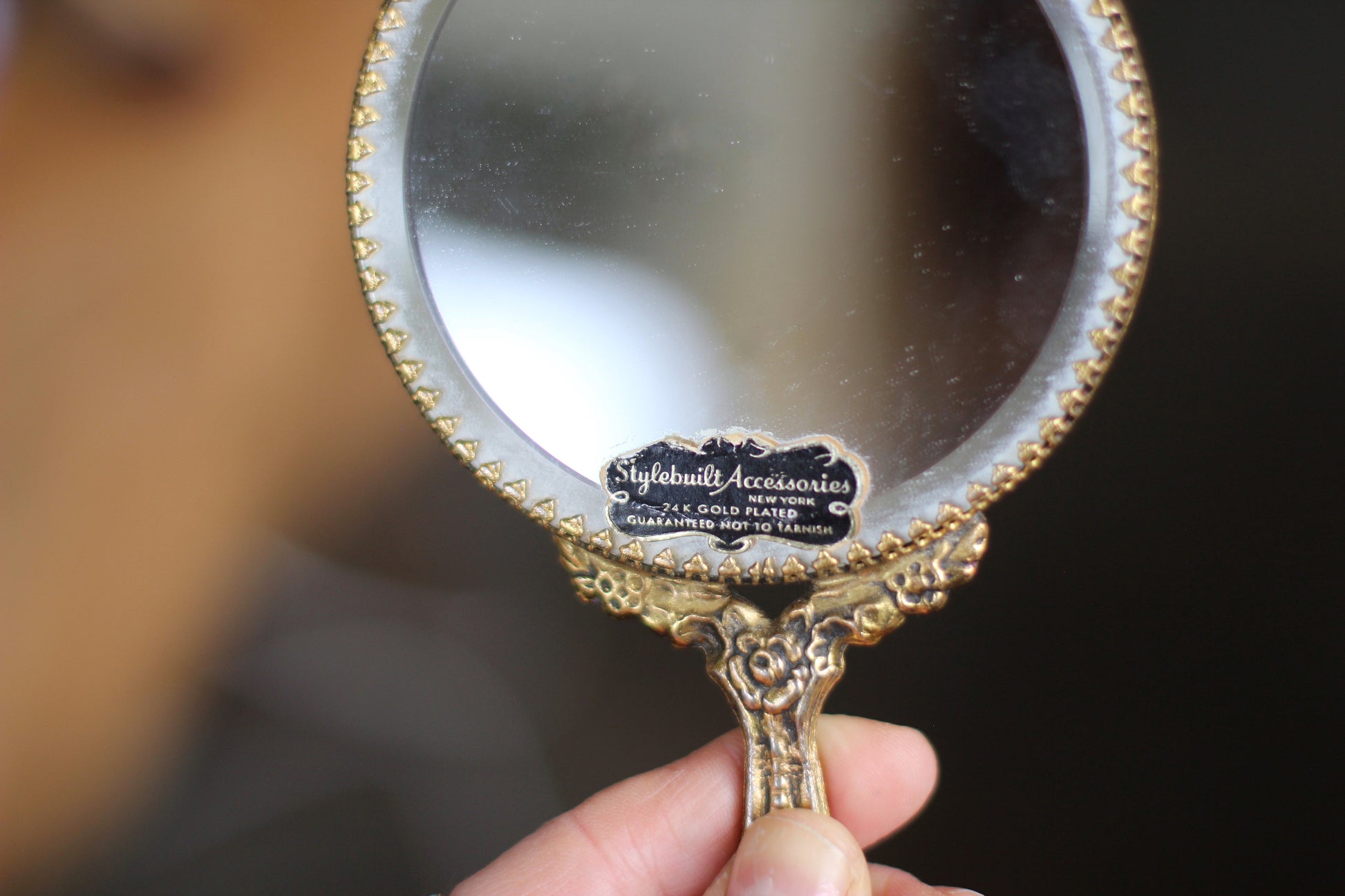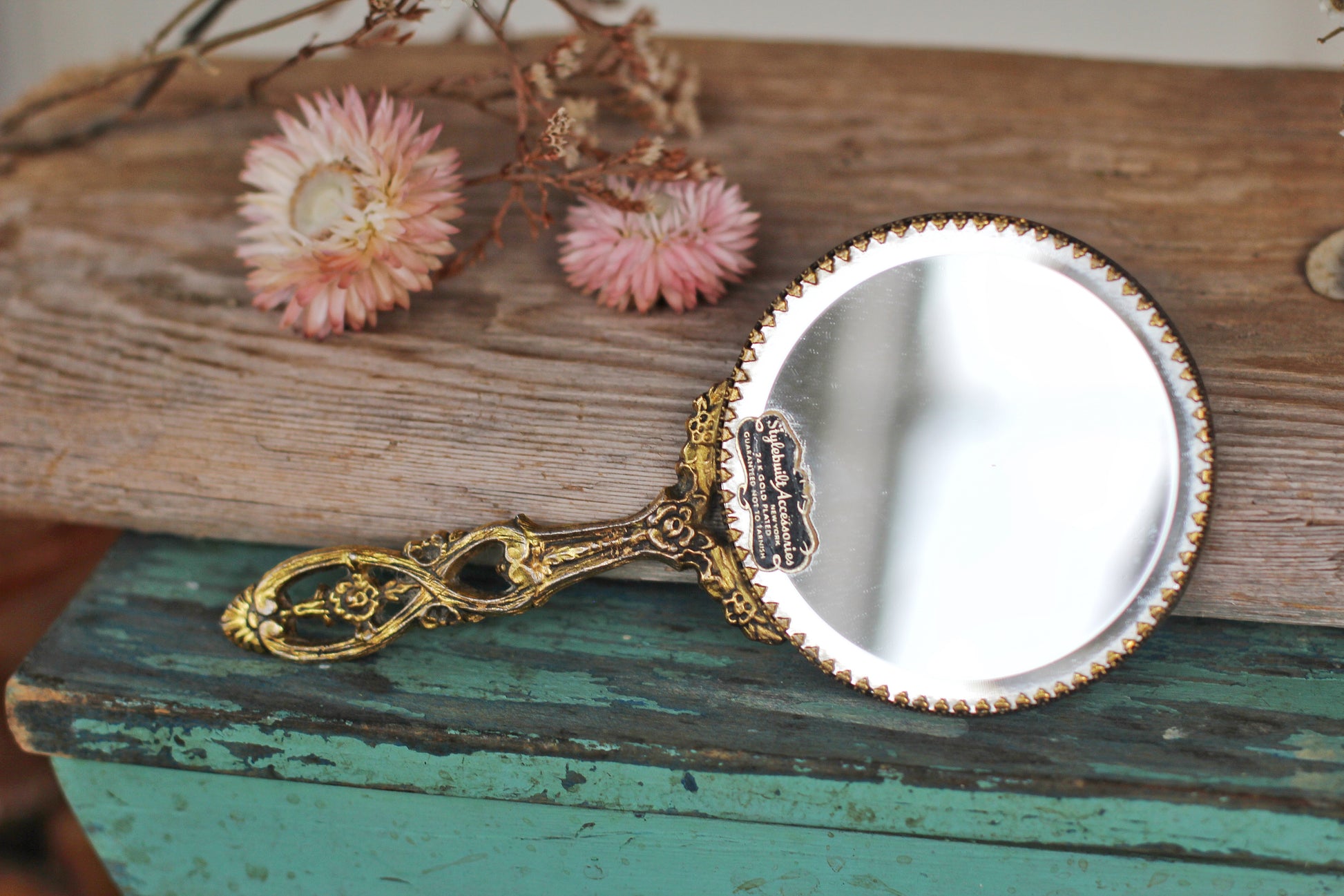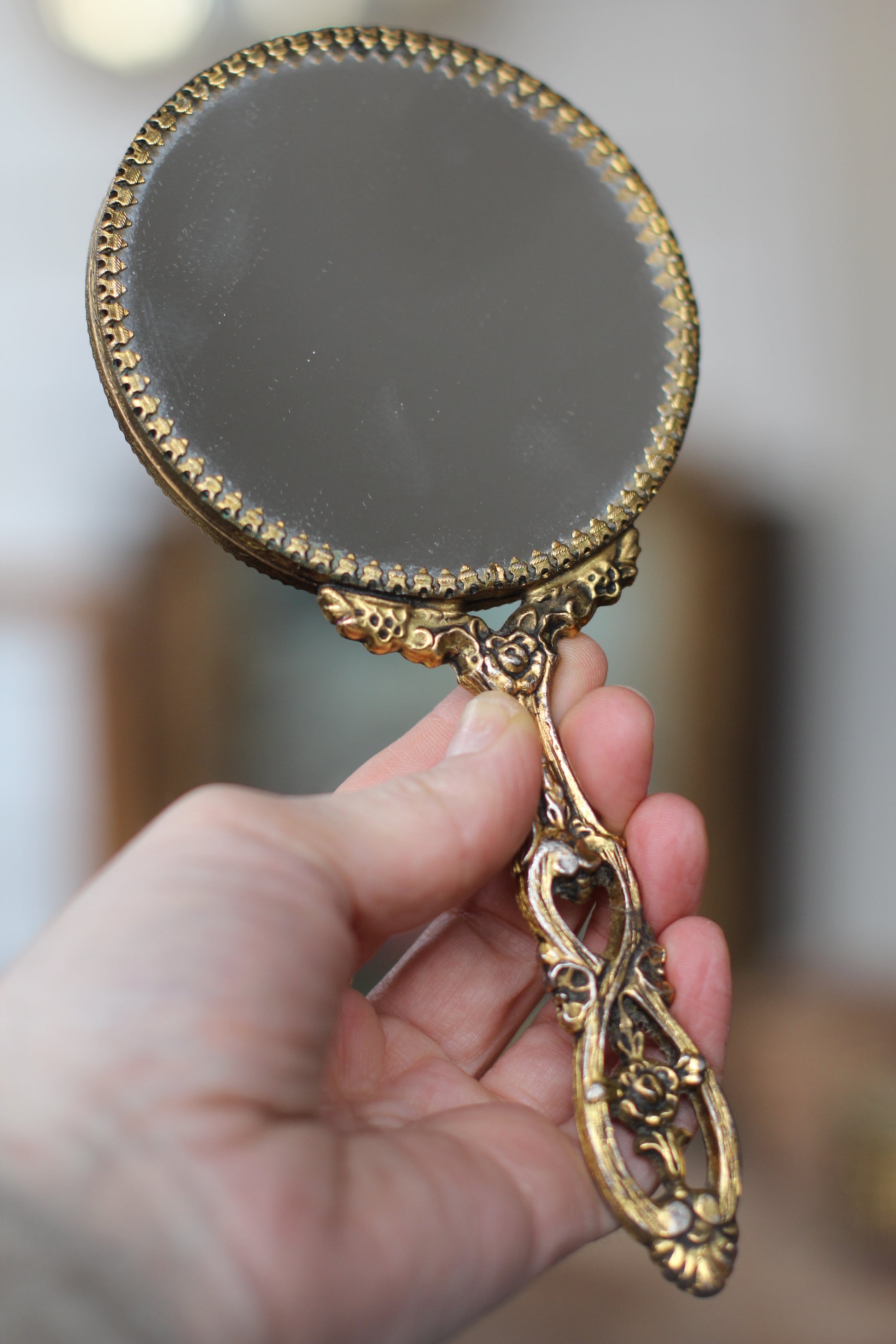 The sweetest tiniest miniature floral gold antique double sided hand mirror. One side is a magnifying mirror while the other side is normal.