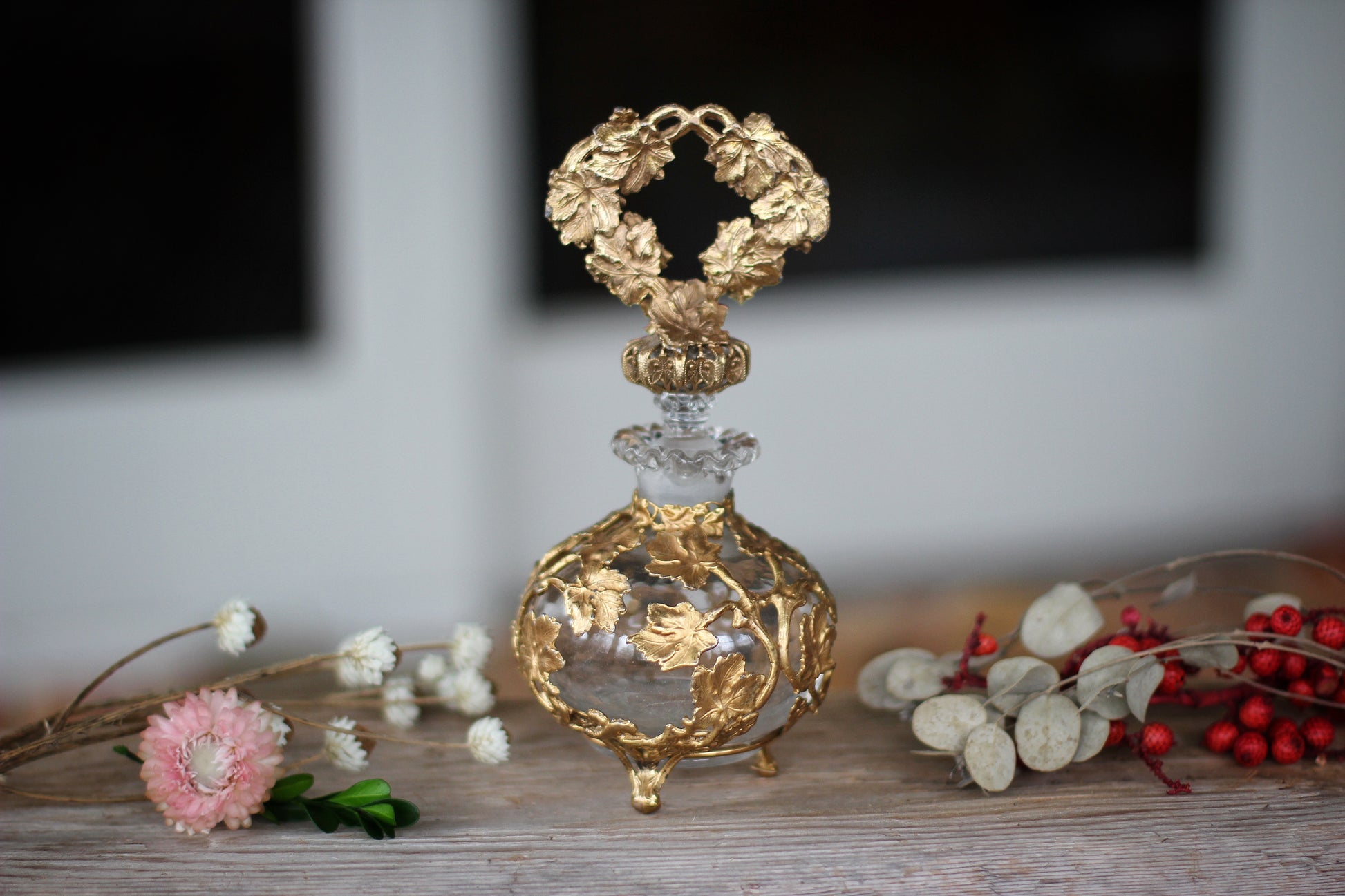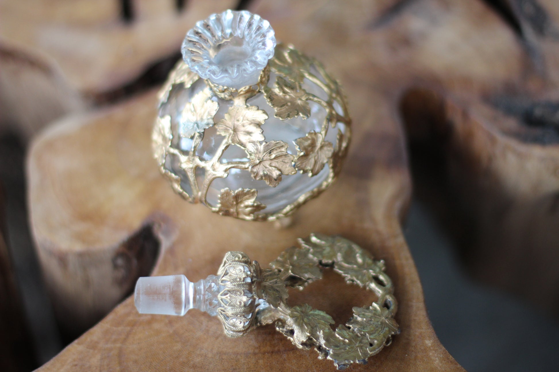 Beautiful and rare bronze / gold ormolu bottle with an intricate leaf topper and the most amazing intricate leaves collar.