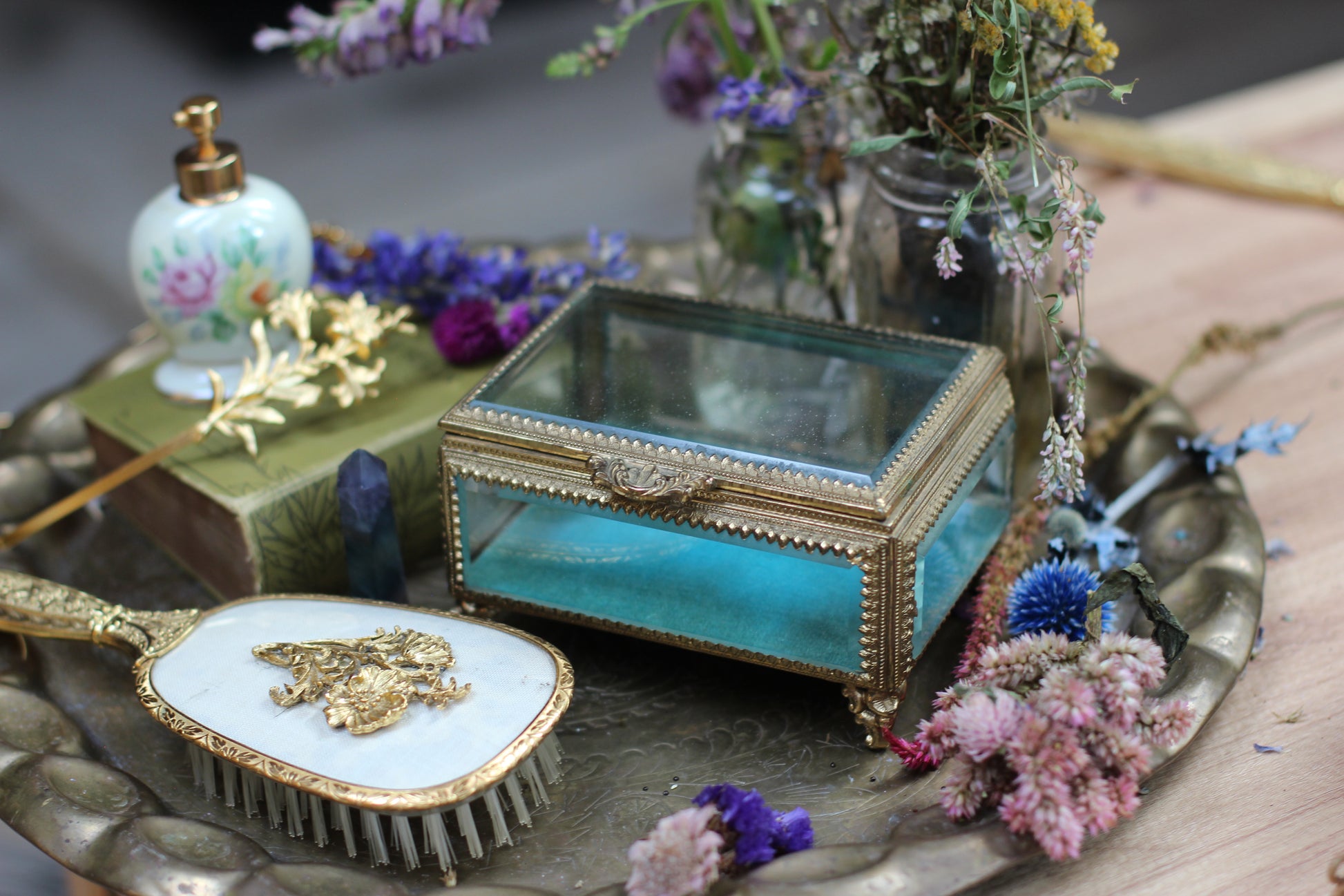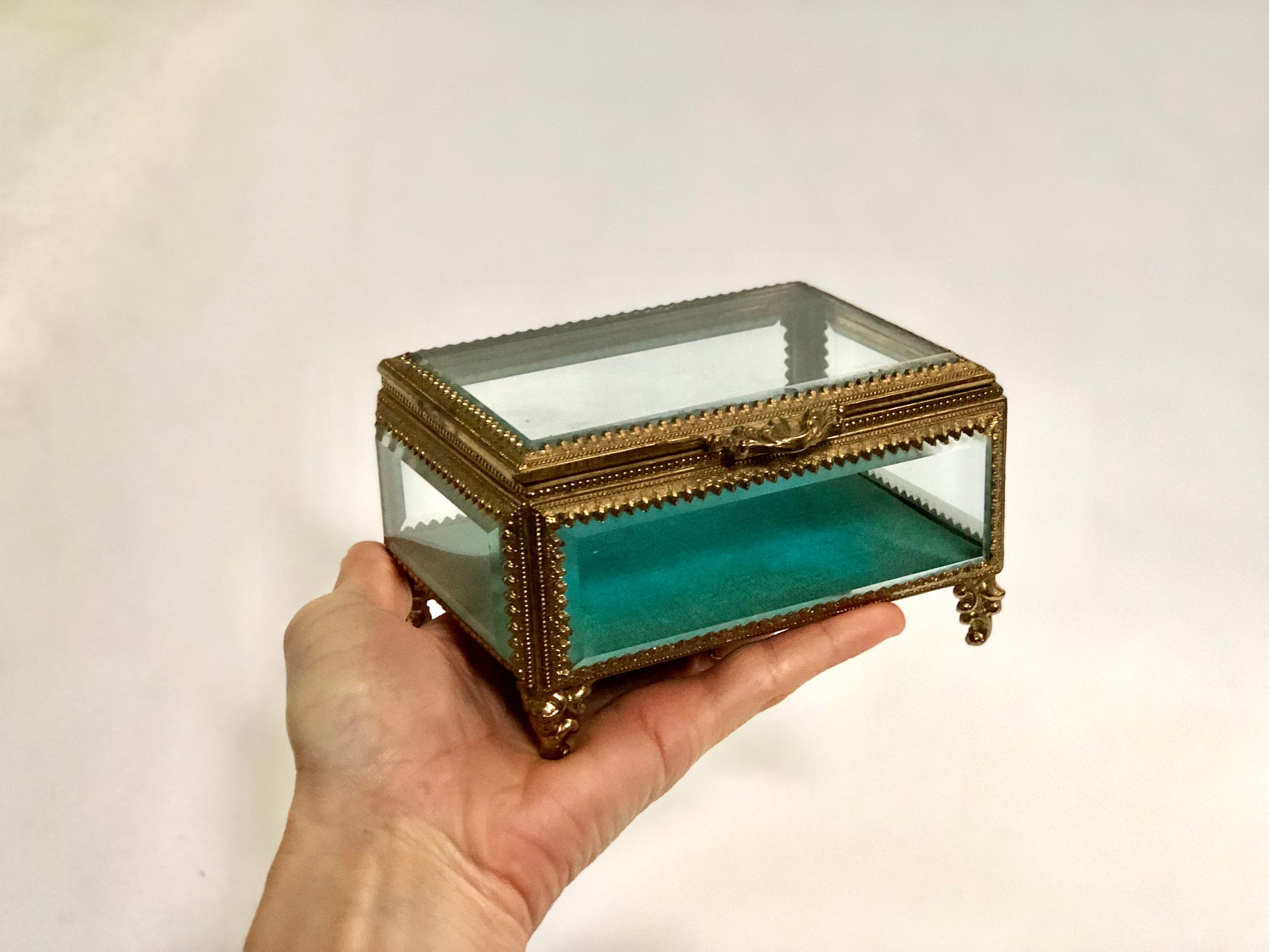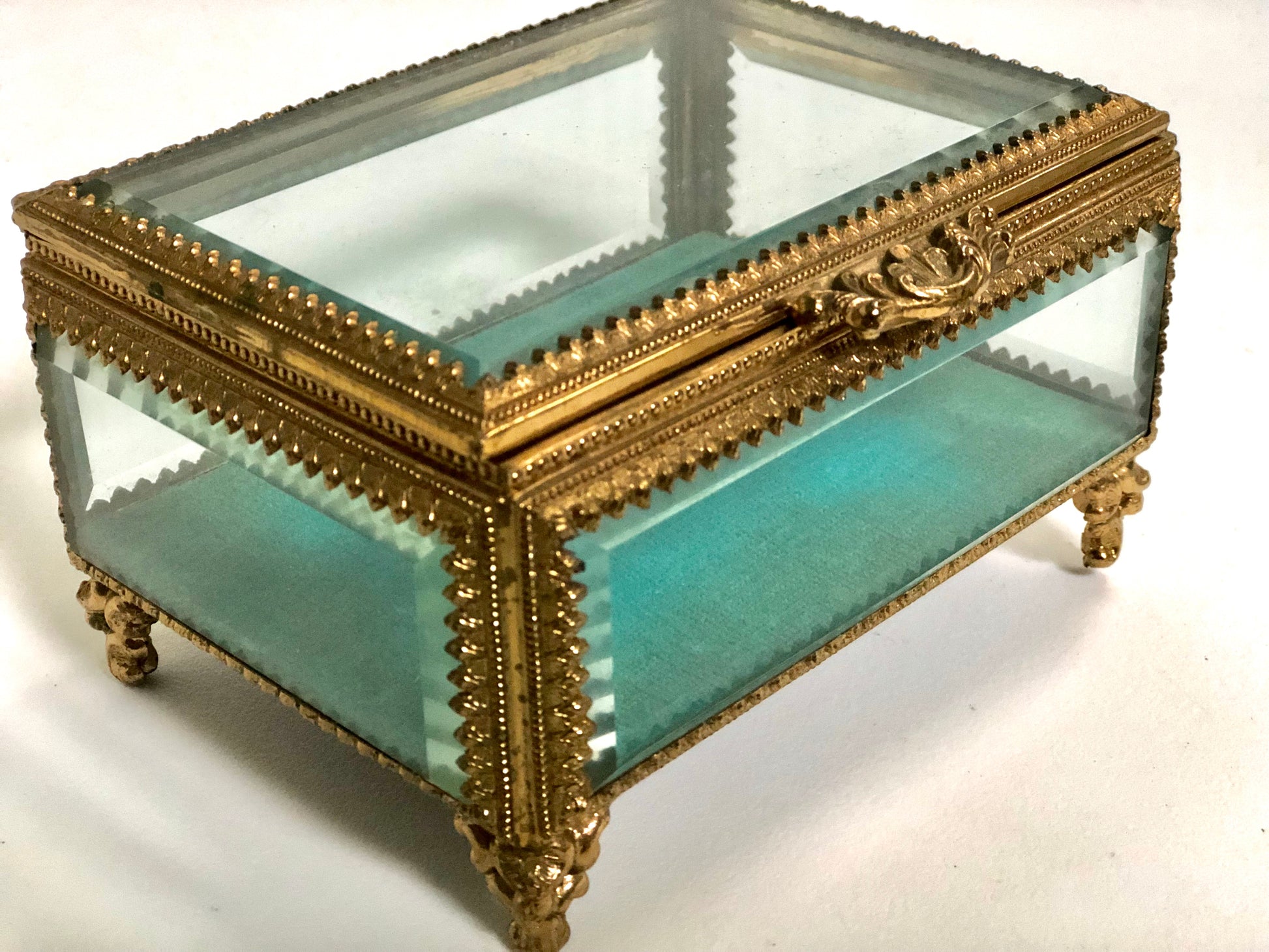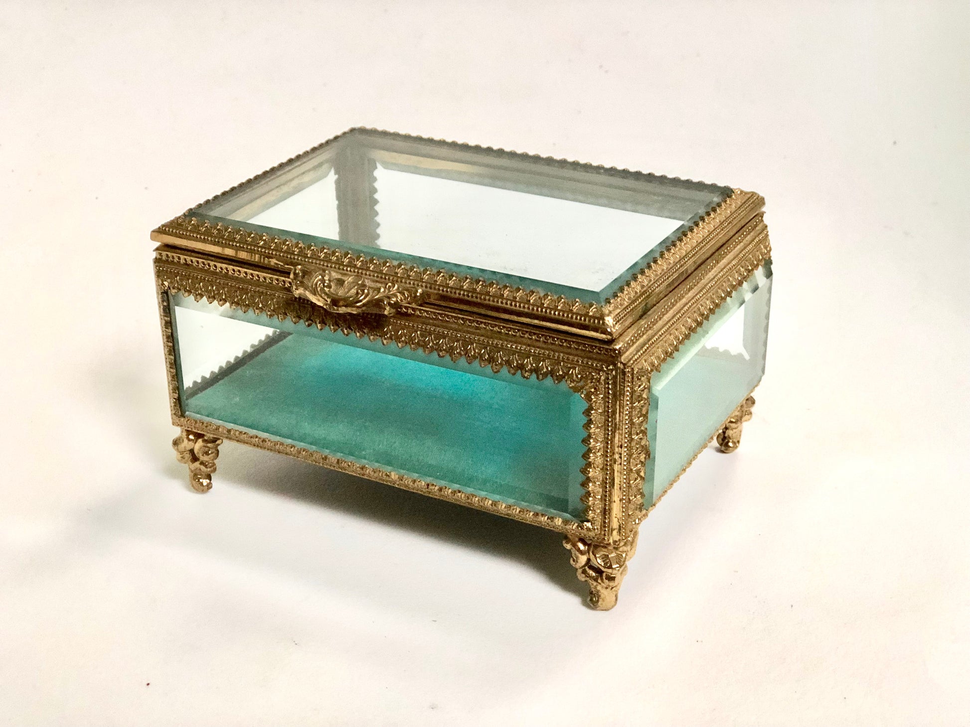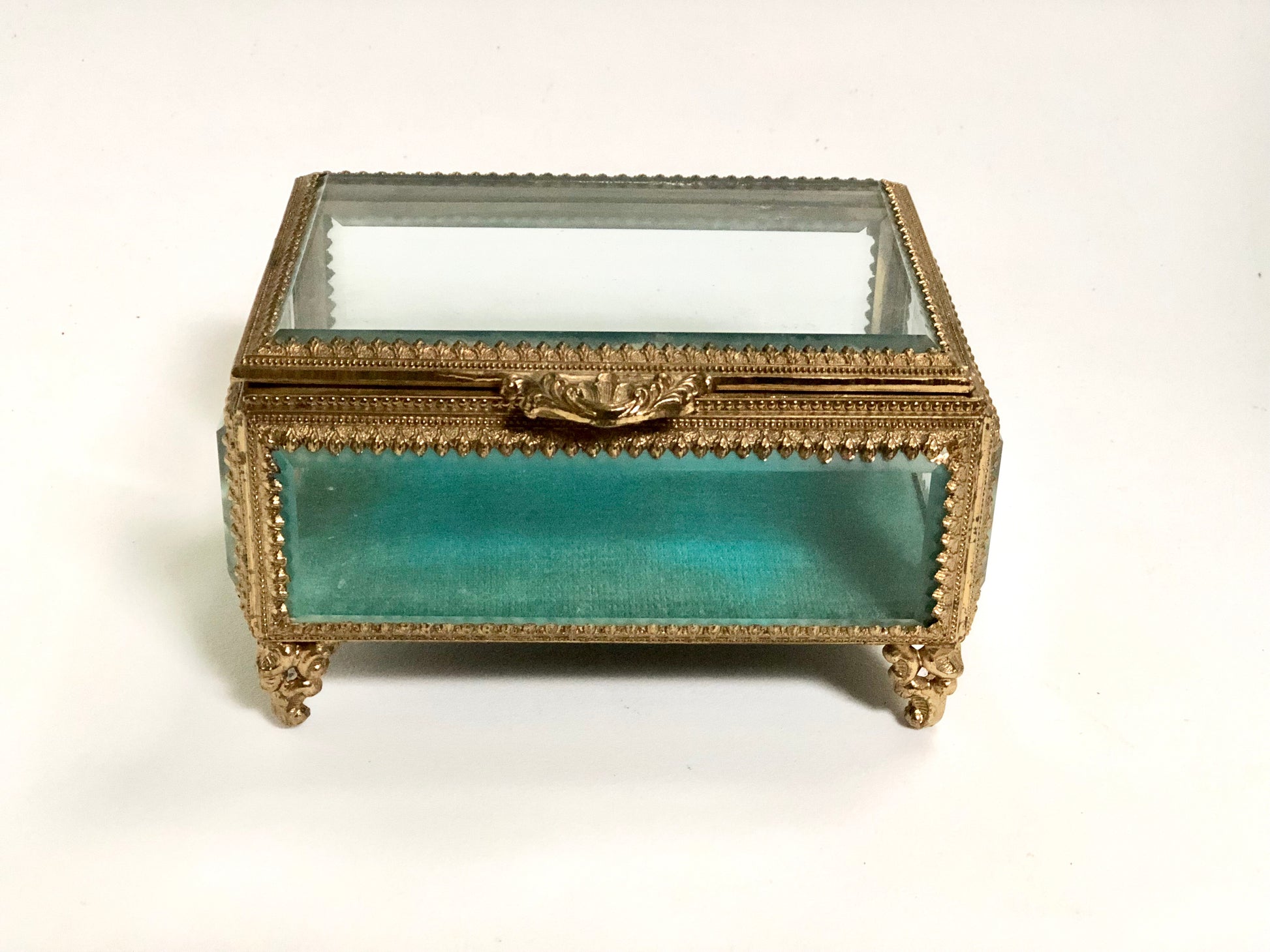 Cute and fancy antique bronze jewelry casket from an unknown maker or era. Has an aged brassy-gold finish to it with a glass top and glass walls with the original teal / turquoise coloured velvet padding. Stands firmly on 4 feet.