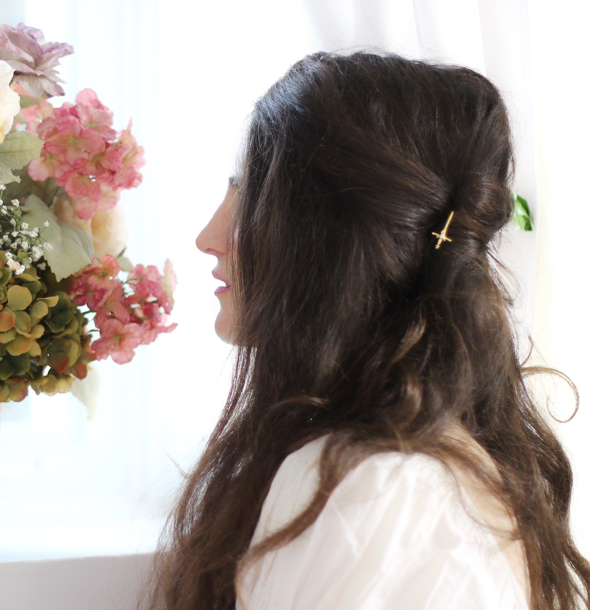 This striking hair pin is inspired by ancient swords of legend, designed to embody strength, beauty, and protection. Each piece is crowned with a light blue-colored stone and a single pearl at the hilt, a reminder that power and grace can coexist.