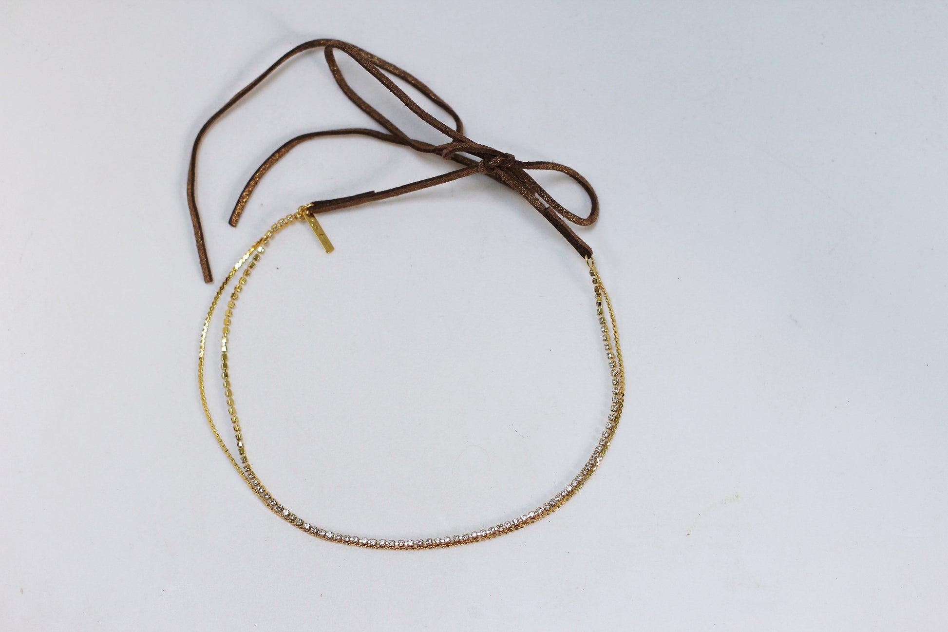 Materials: Made from crystals and high quality 14k gold-plated brass, 14k rose-gold plated brass, or silver-plated brass. All metals are nickel-free. Ties are made from brown faux suede.