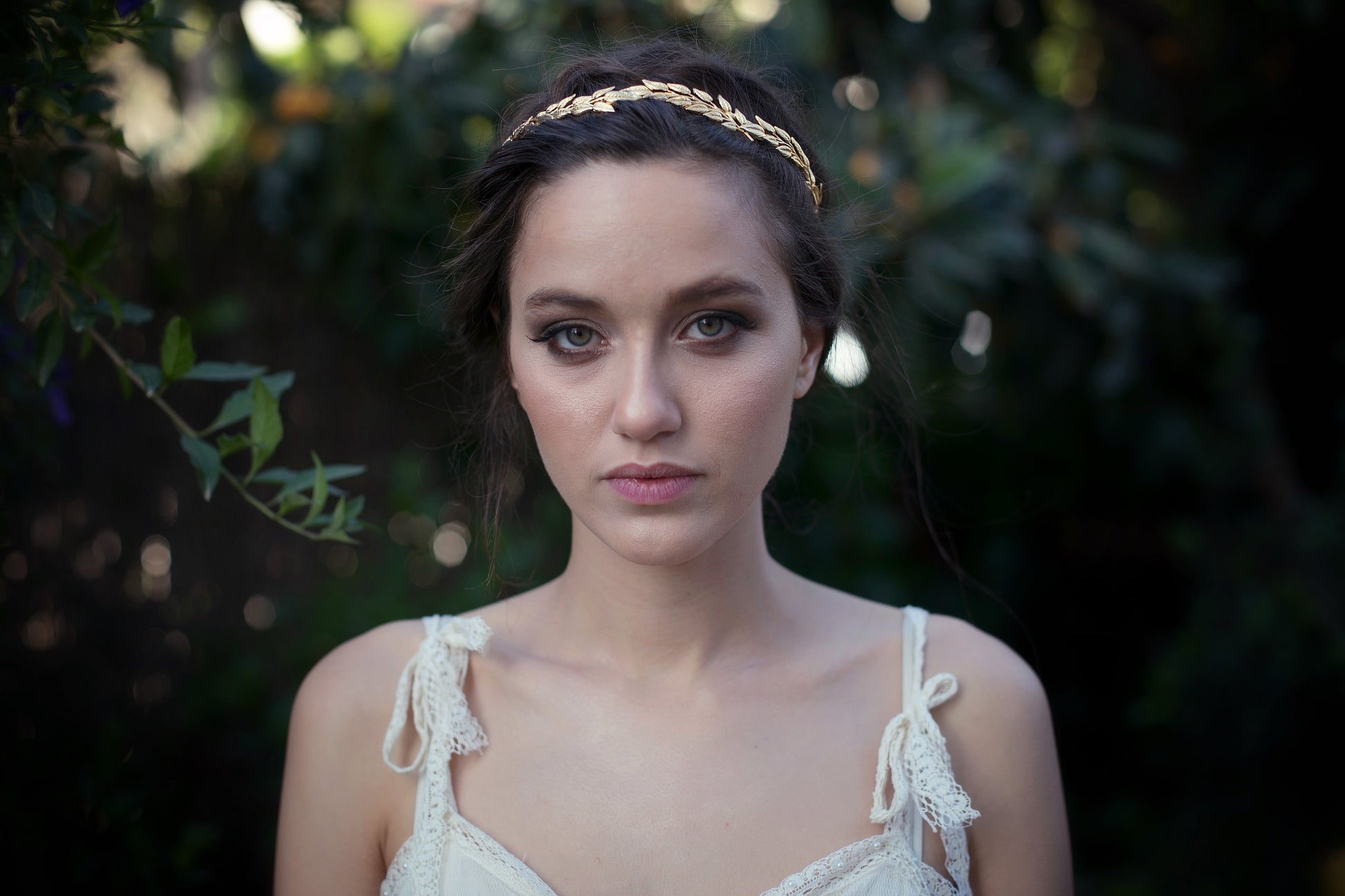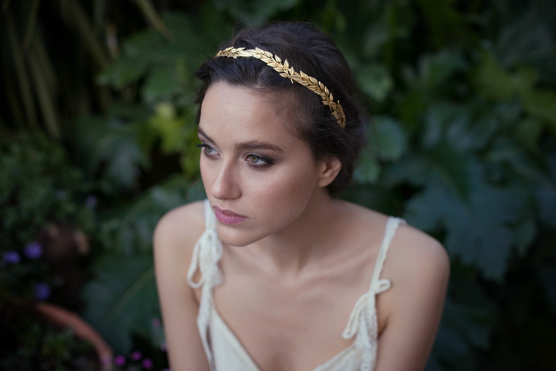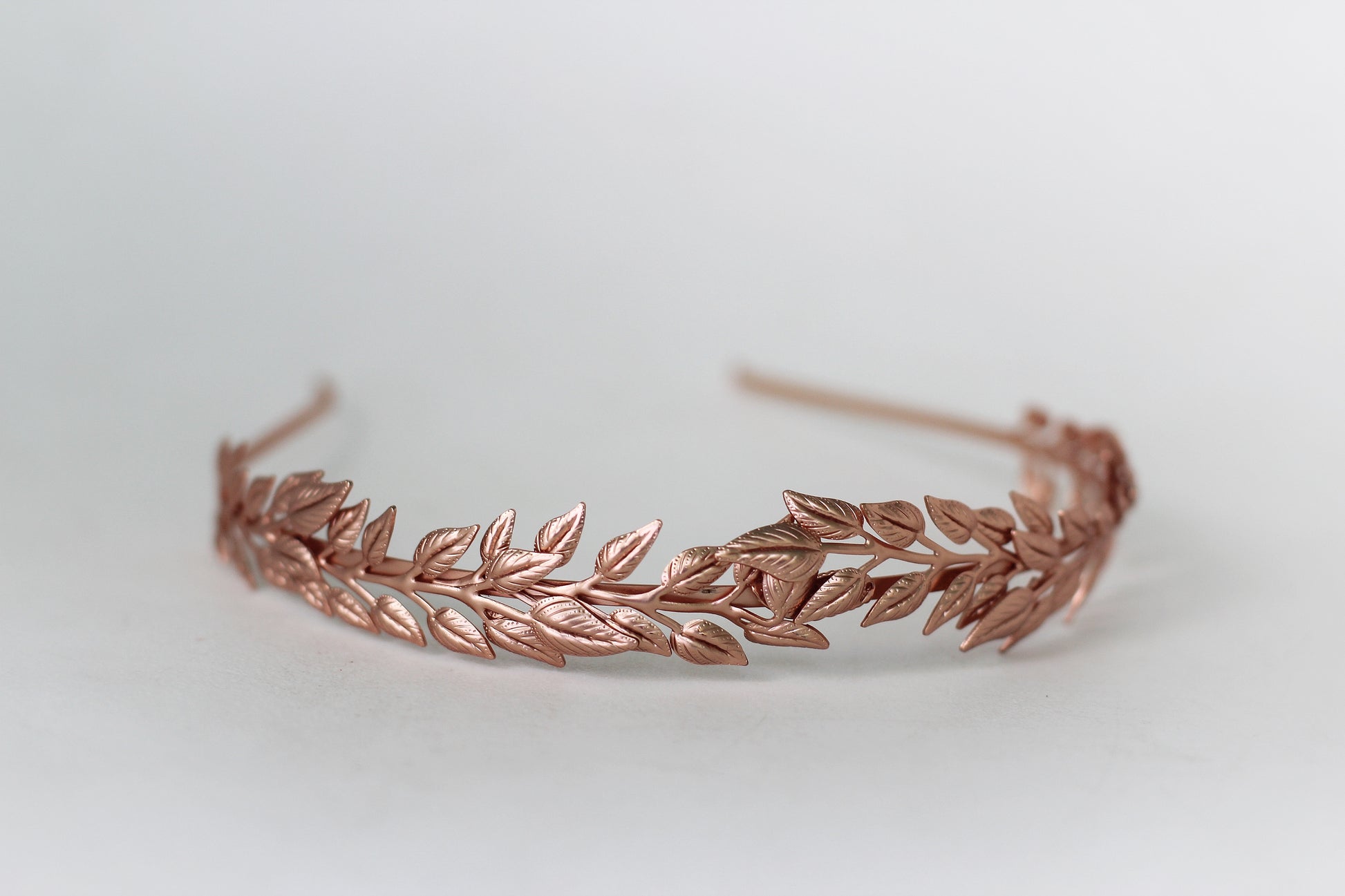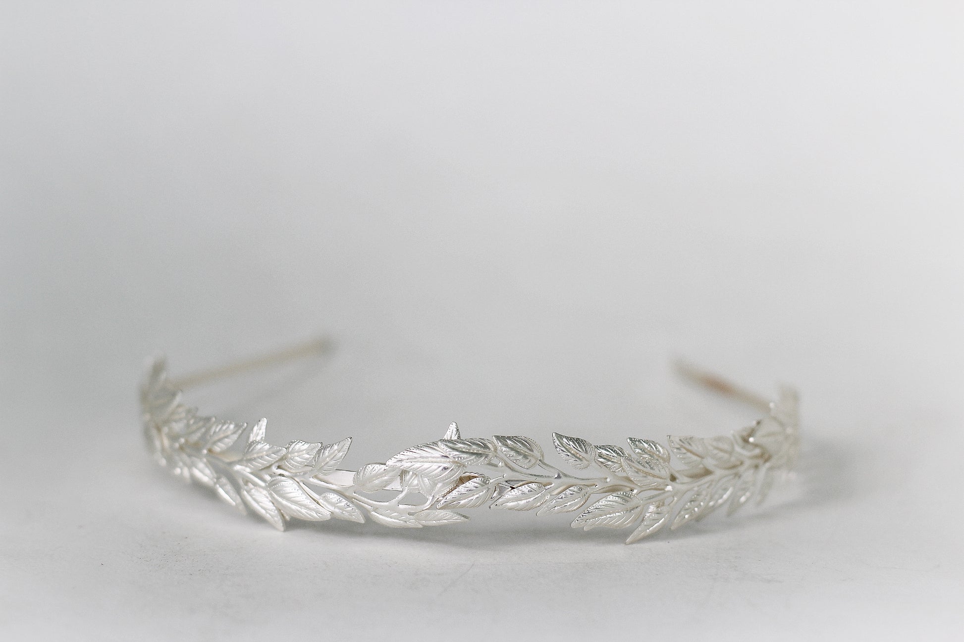 This headband takes the design of a traditional headband and adds a mythological elegance for the ultimate headpiece with approachable functionality. It features a laurel wreath made up of intricate olive leaves soldered securely to a flexible band.