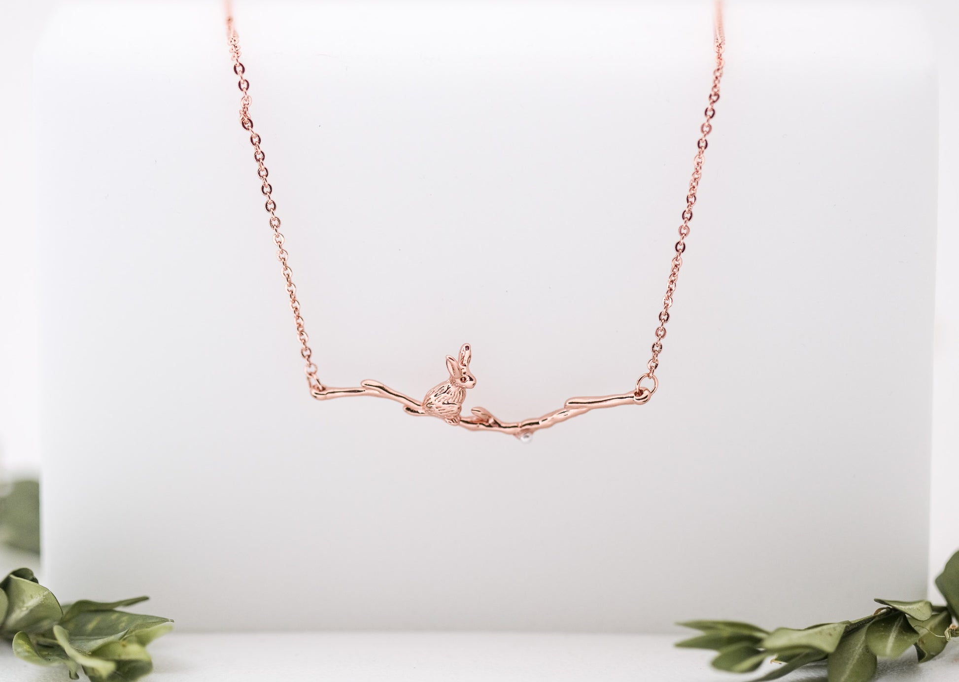 This beautiful chain necklace is decorated in the center with a delicate and rustic looking branch, along with the sweetest little bunny rabbit sitting on it along with a tiny seed pearl.