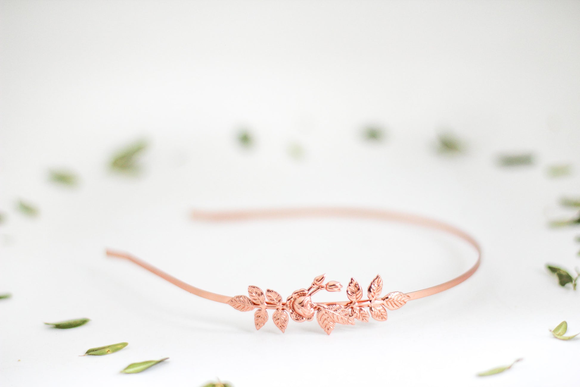 This asymmetrical headband takes the design of a traditional headband and adds a dash of romance for the ultimate headpiece with approachable functionality. It features a rose, rosebuds, and leaves soldered securely to a flexible band.