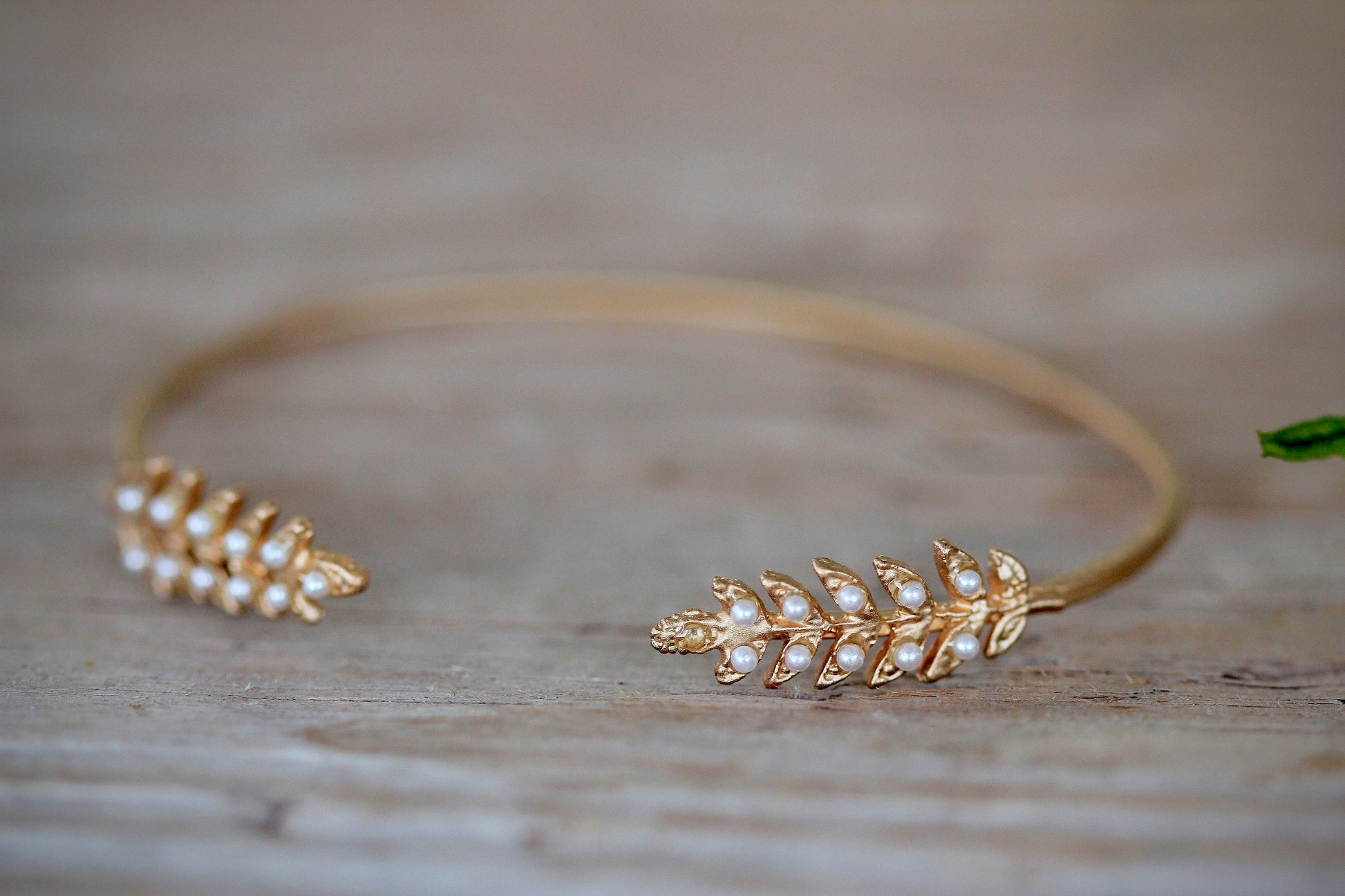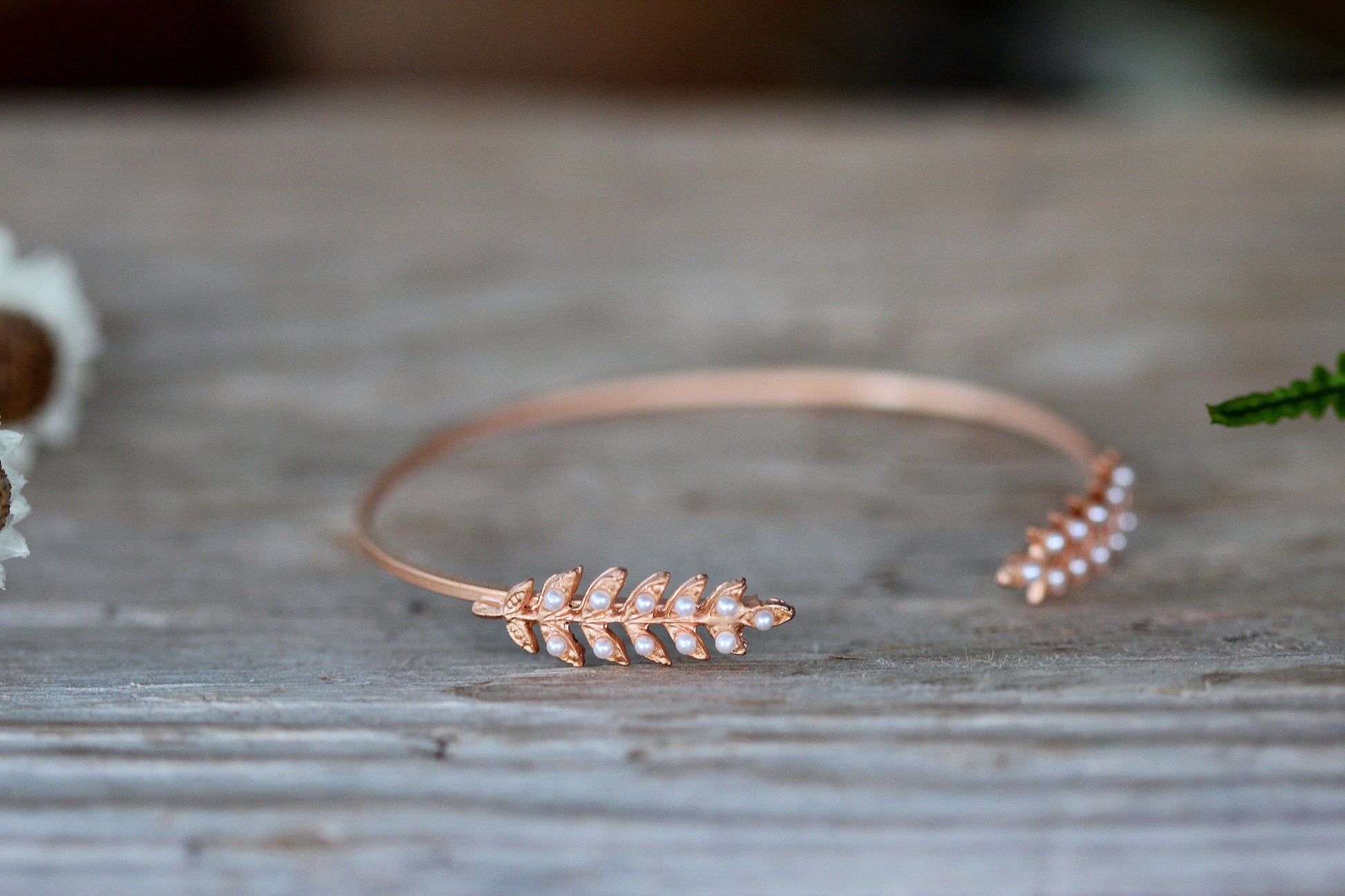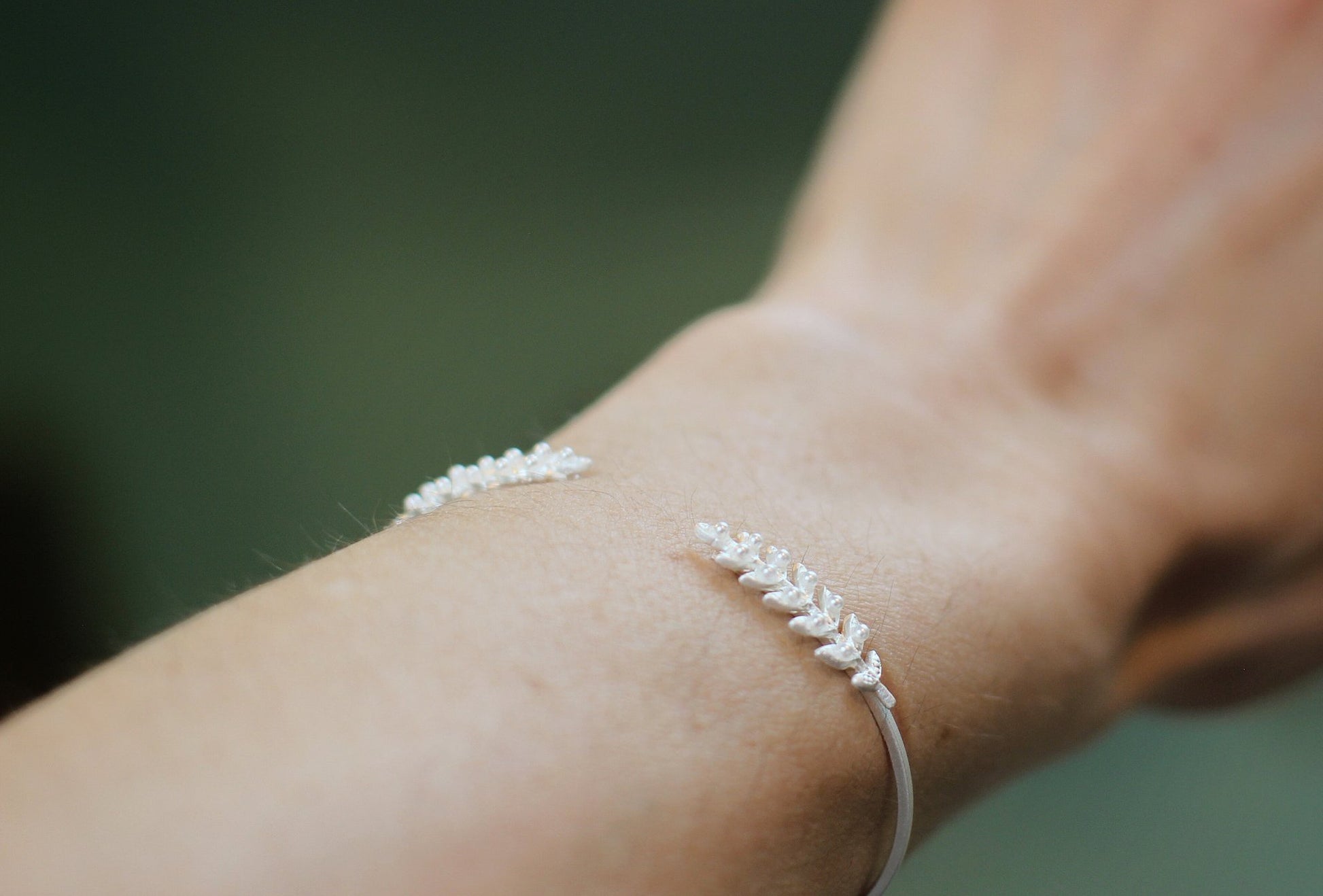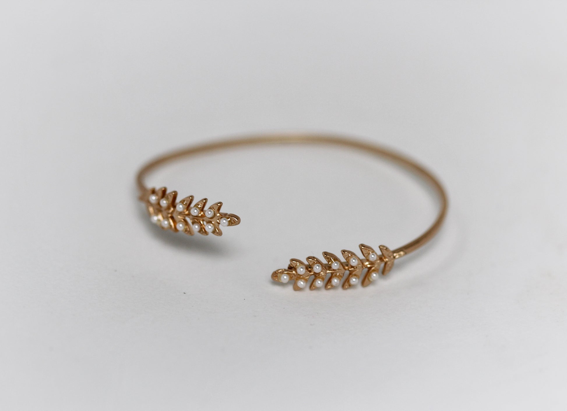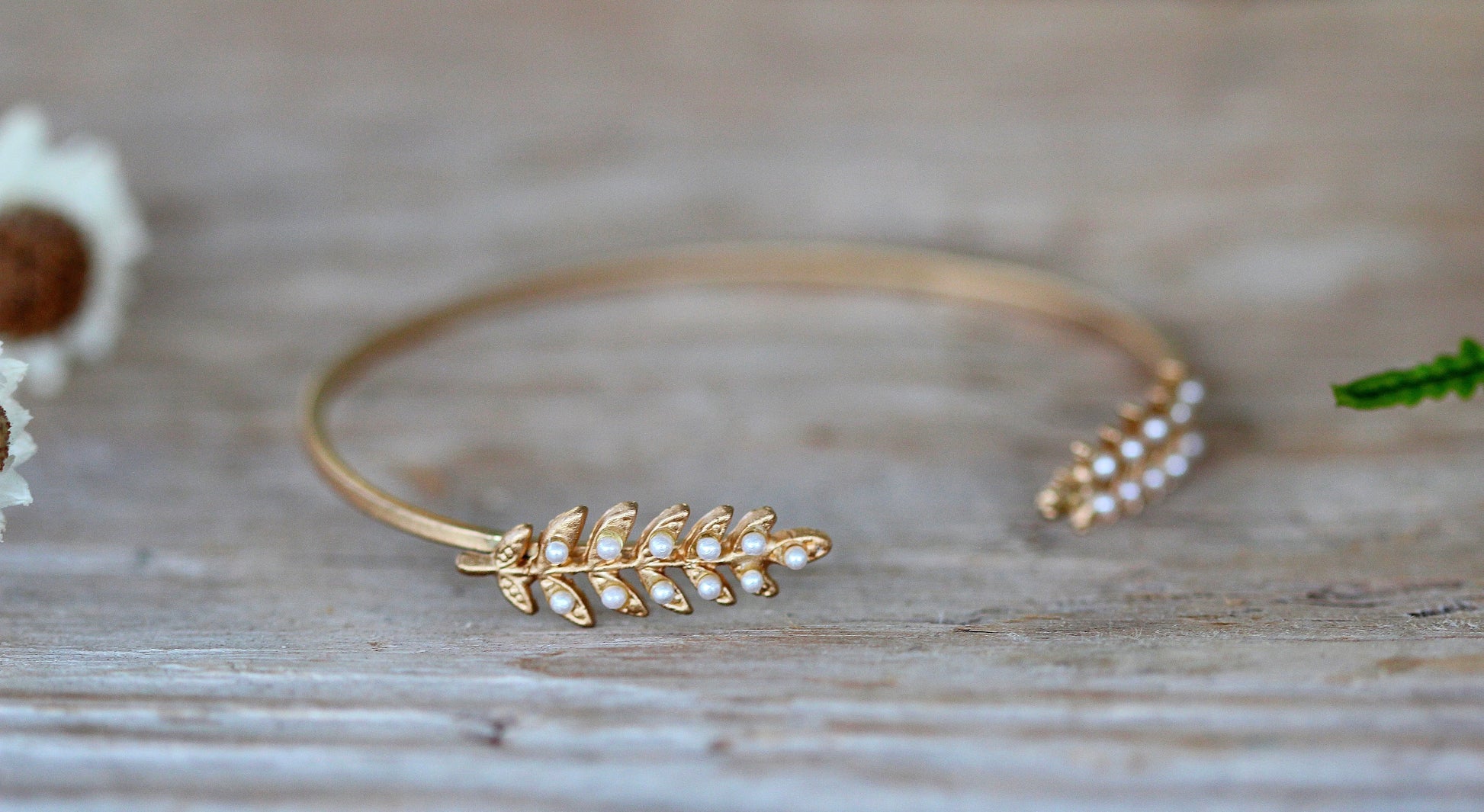 This dainty open bracelet is decorated on each side with a little Branch full of little twigs and tiny little pearls.