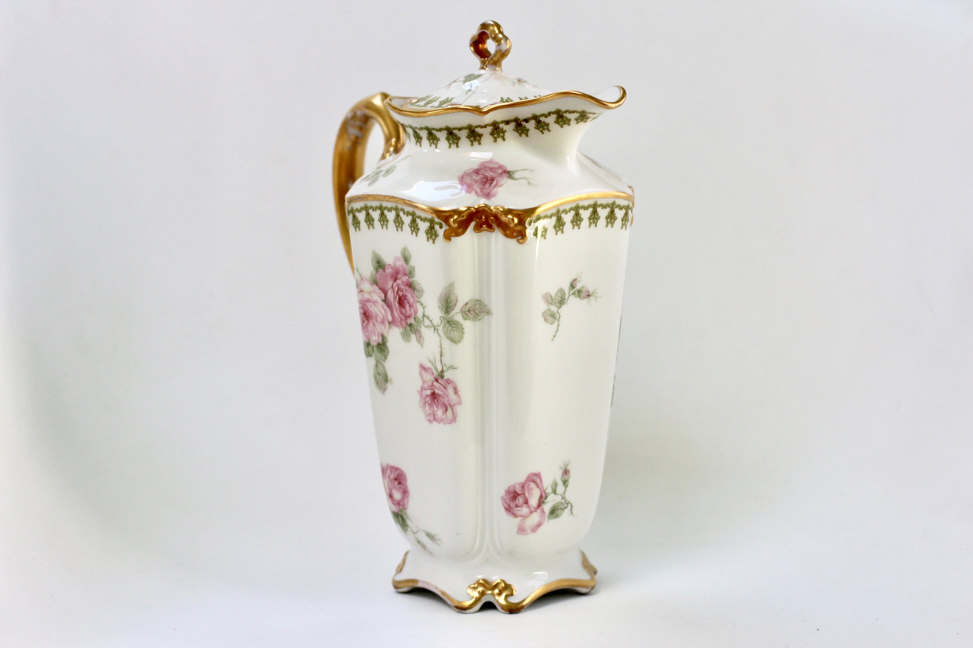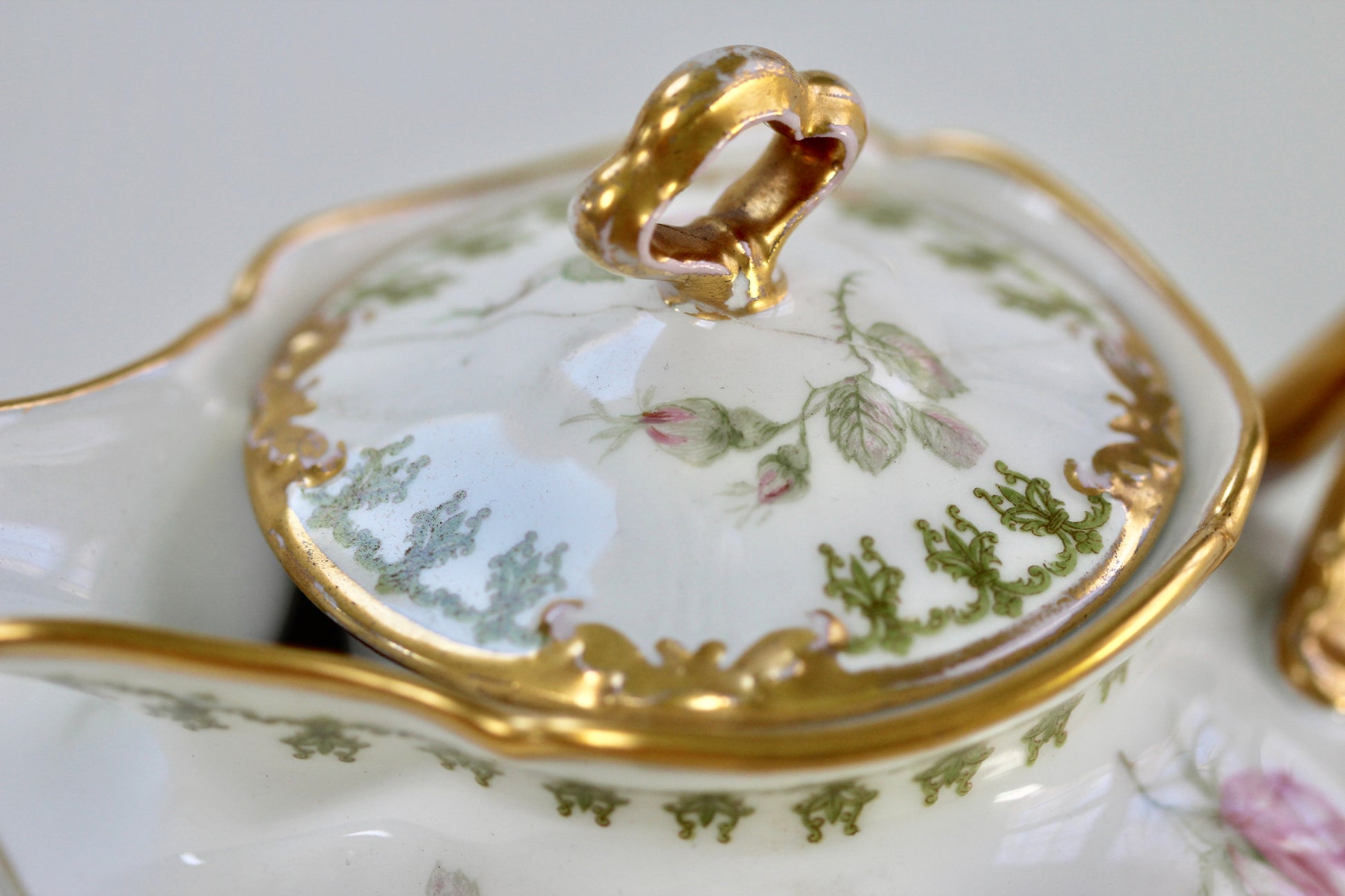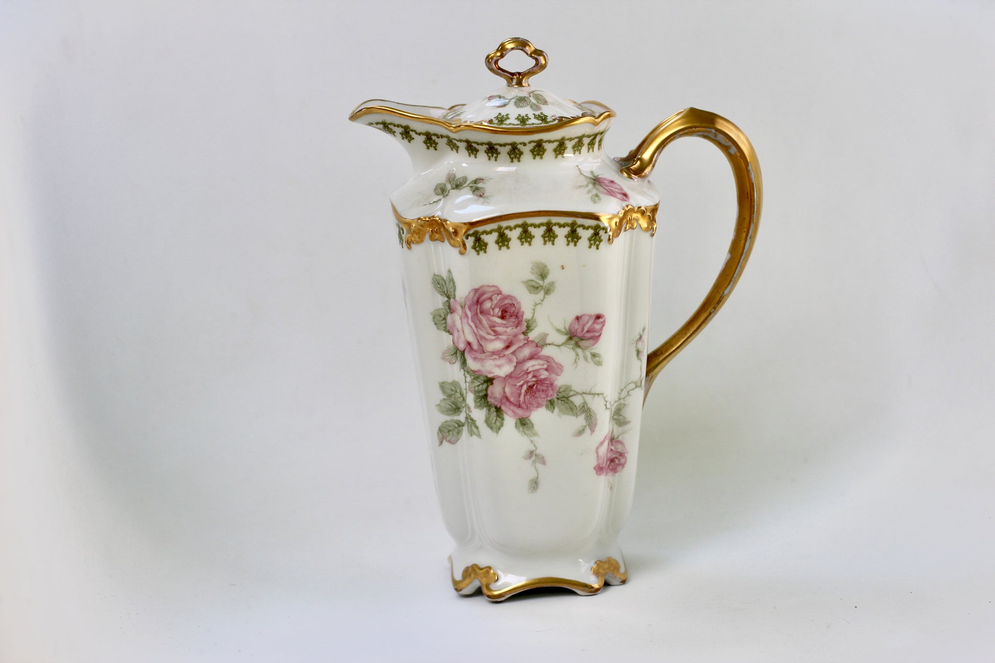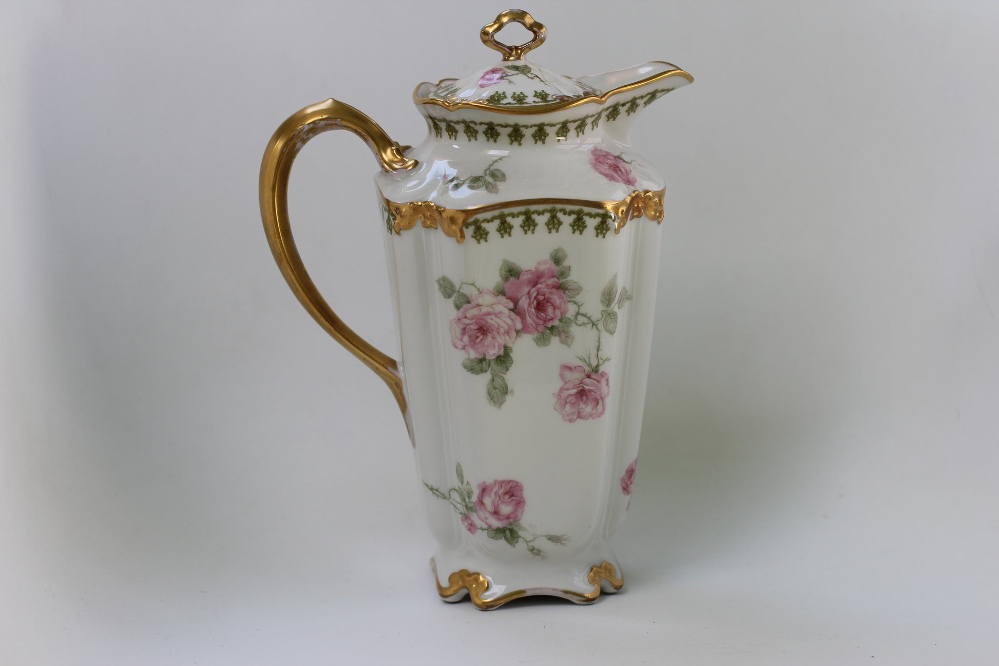This is a stunning antique white porcelain tea pot with intricate flowers and leaves decorating the surface, with touches of pink, green and gold. Has a gold handle on the lid as well as the tea pot and gold rims. Signed by Limoges France GDA.