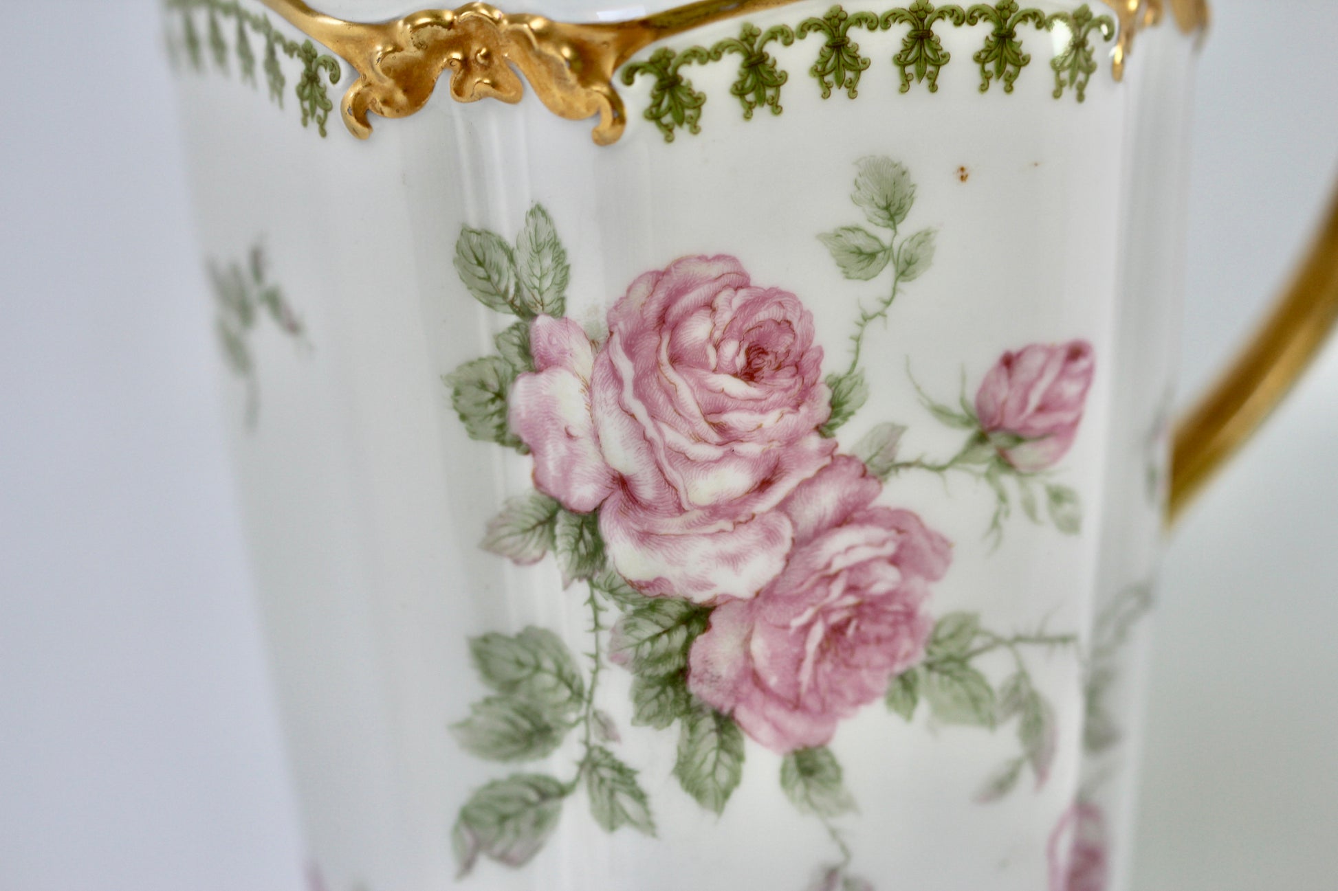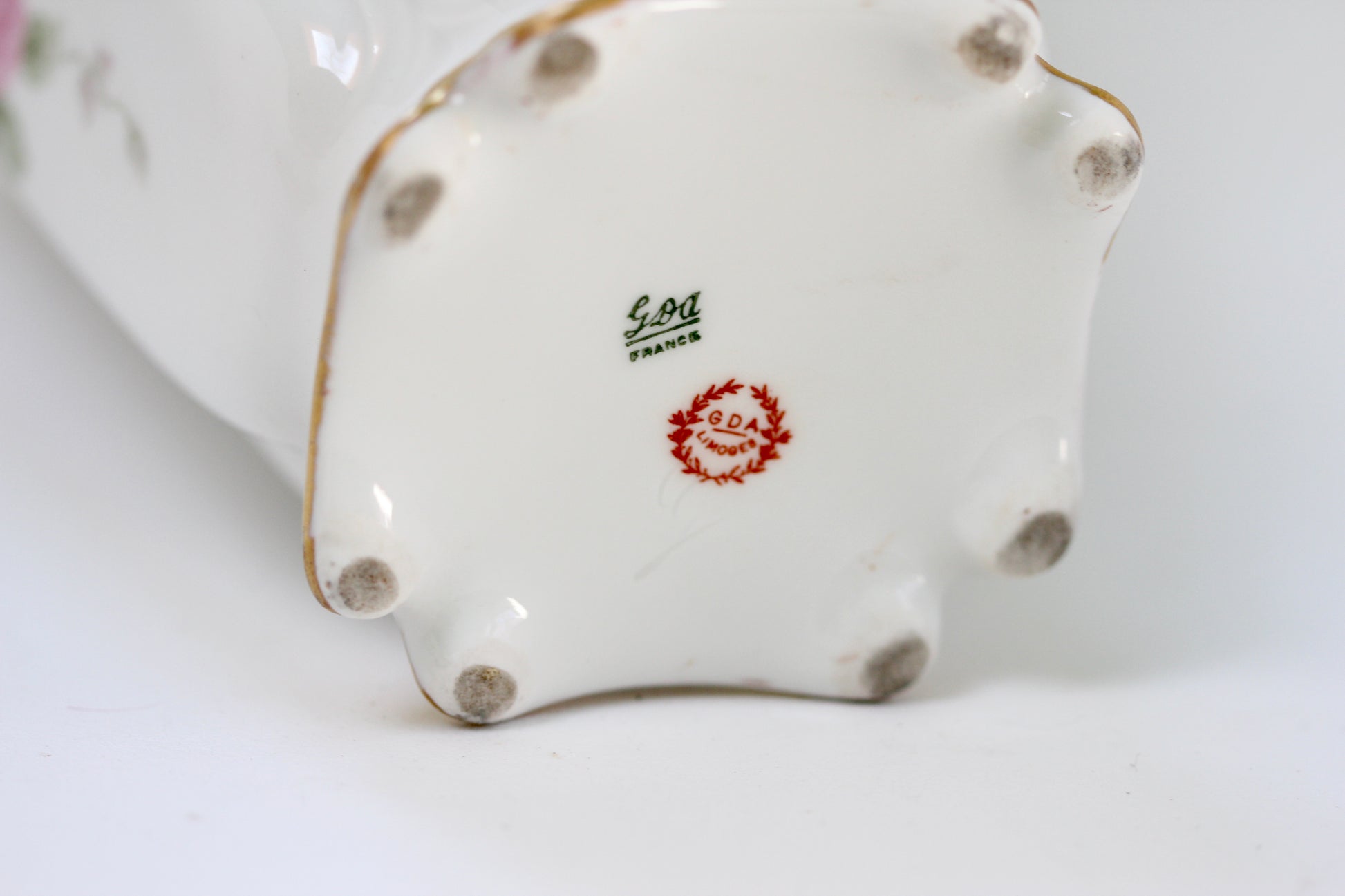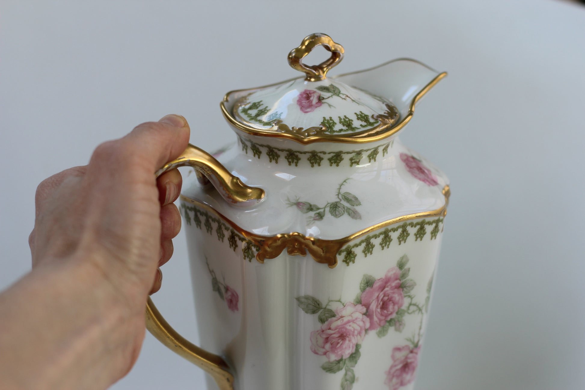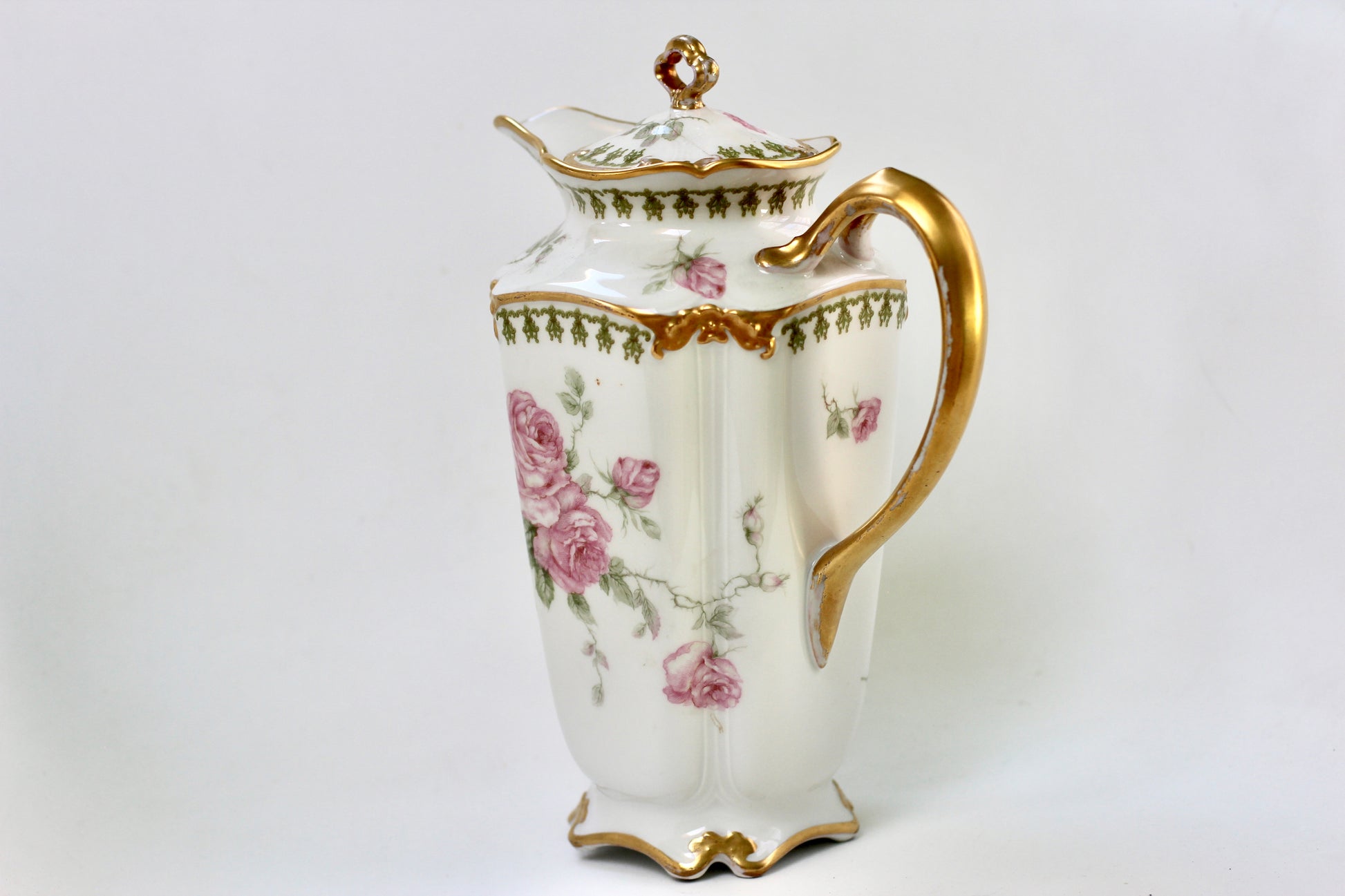 This is a stunning antique white porcelain tea pot with intricate flowers and leaves decorating the surface, with touches of pink, green and gold. Has a gold handle on the lid as well as the tea pot and gold rims. Signed by Limoges France GDA.